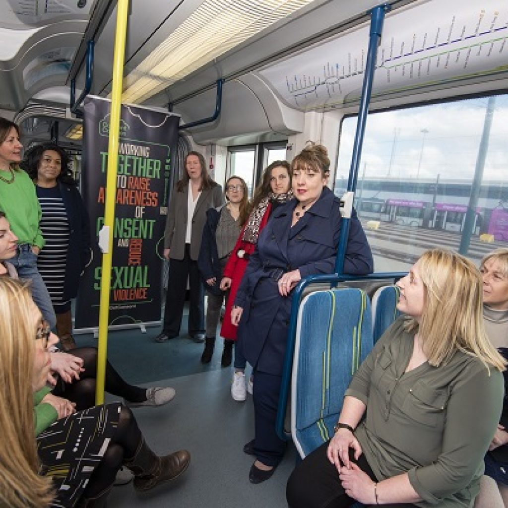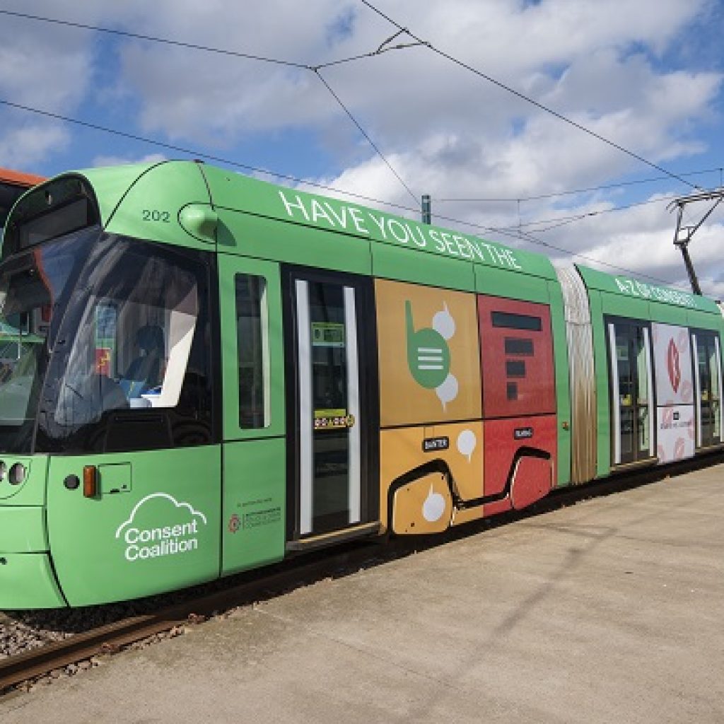 Bus and Tram Wrapped in the A-Z of Consent is launched in Nottingham as part of the Safer Women at Night (SWaN) funding.