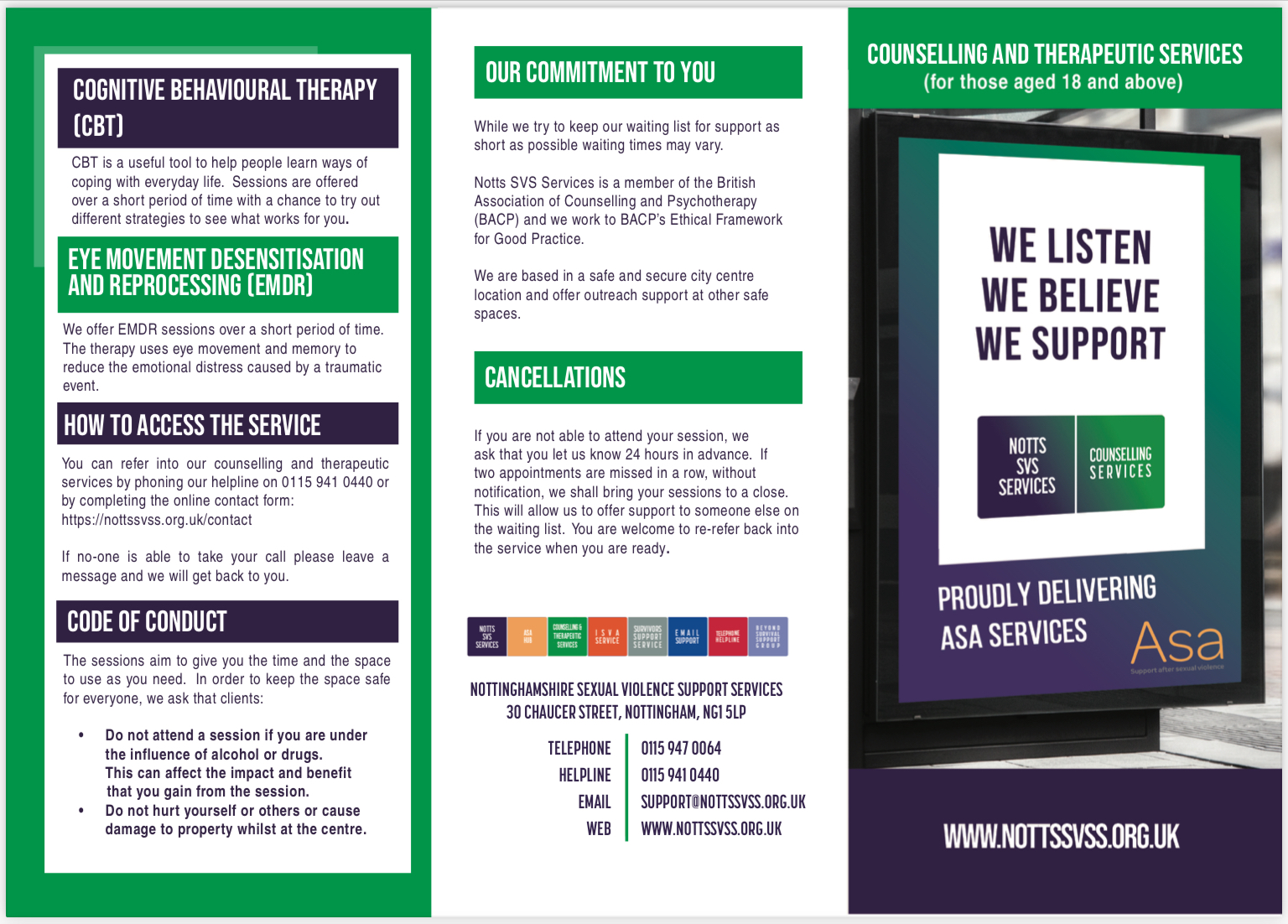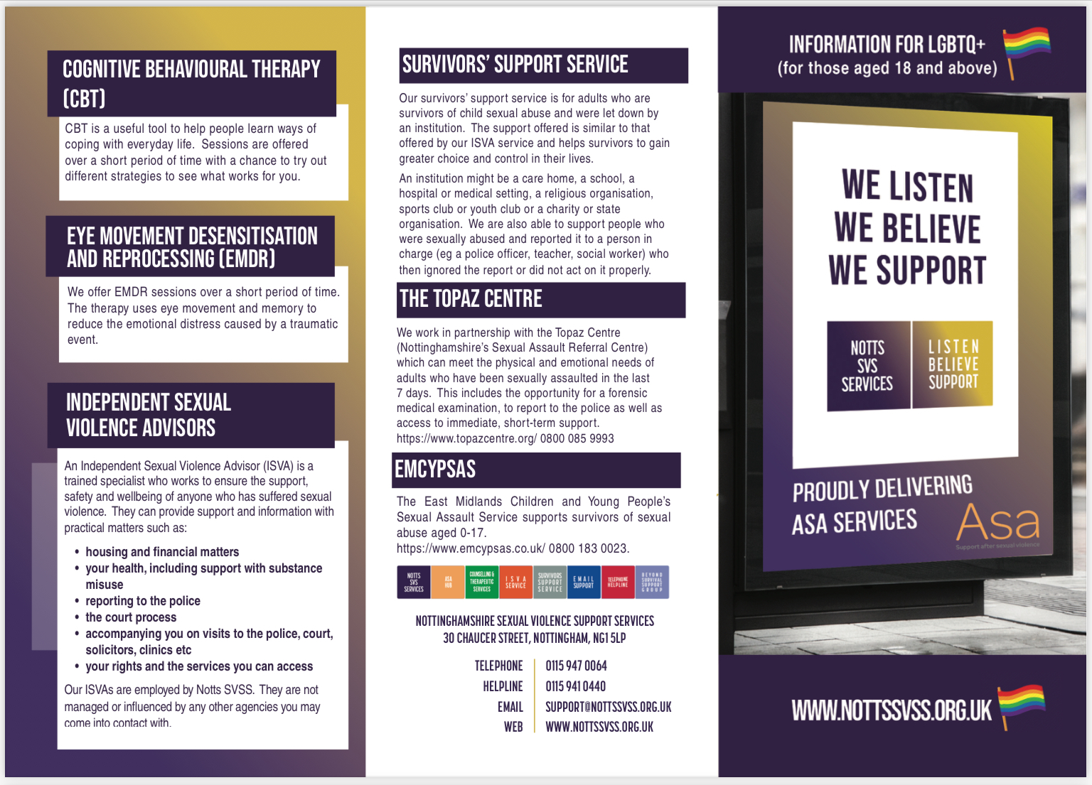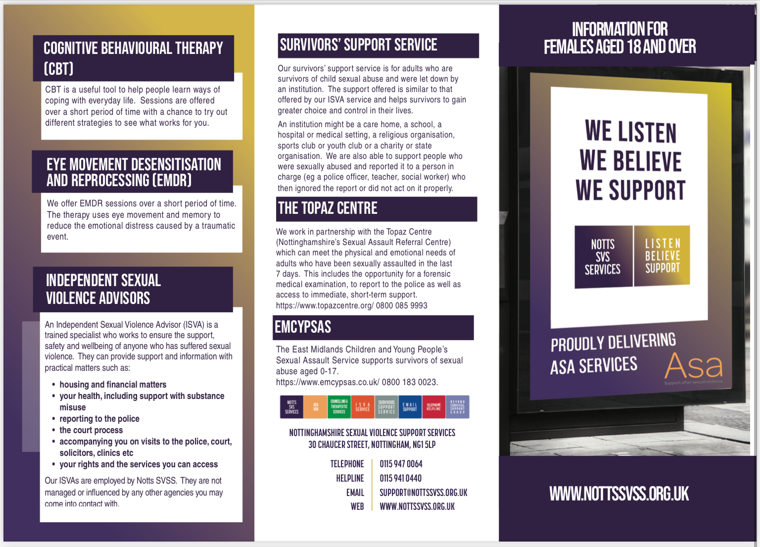 We provide a wide range of downloads including leaflets and posters to help raise awareness of Notts SVS Services.