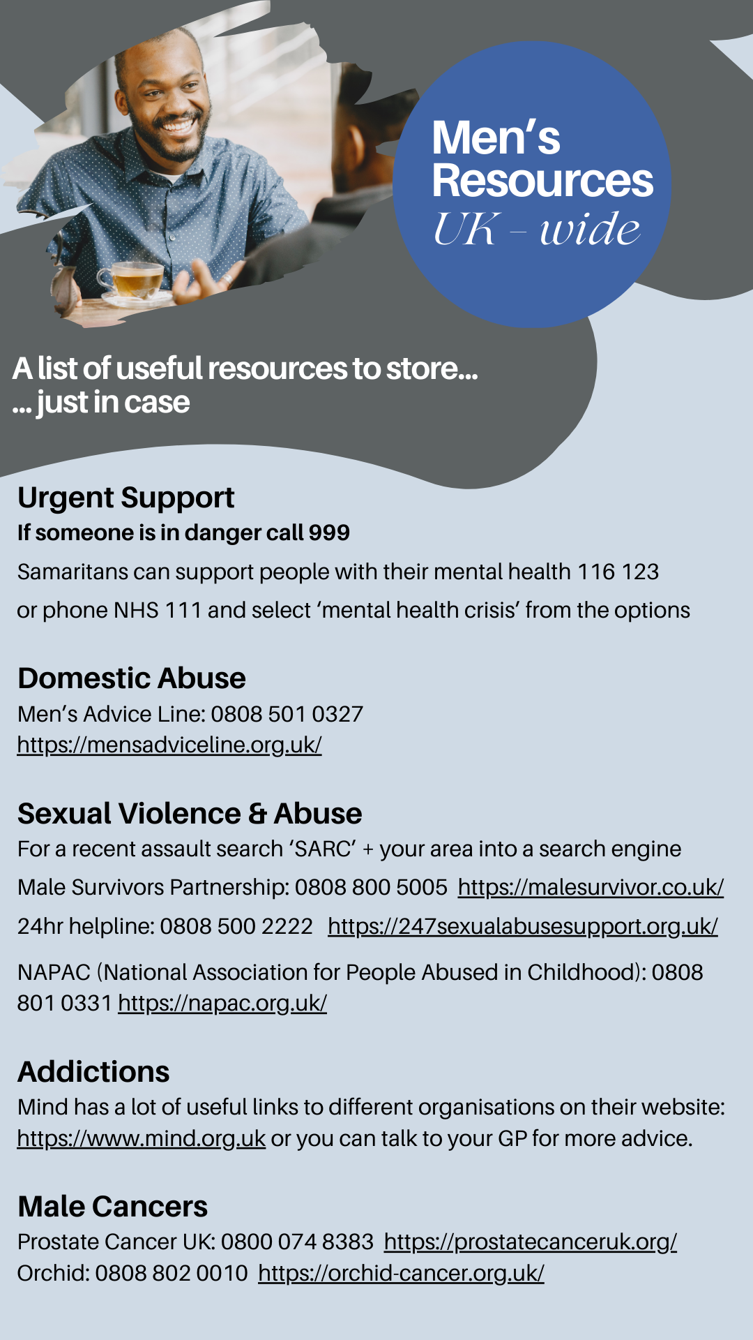 Don’t know where to start – well we’ve done the hard work for you!  So why not select the links below to find out about some key organisations.  Better still, take a screenshot and keep it in you photo favourites just in case.  You or your mate might really appreciate it one day!